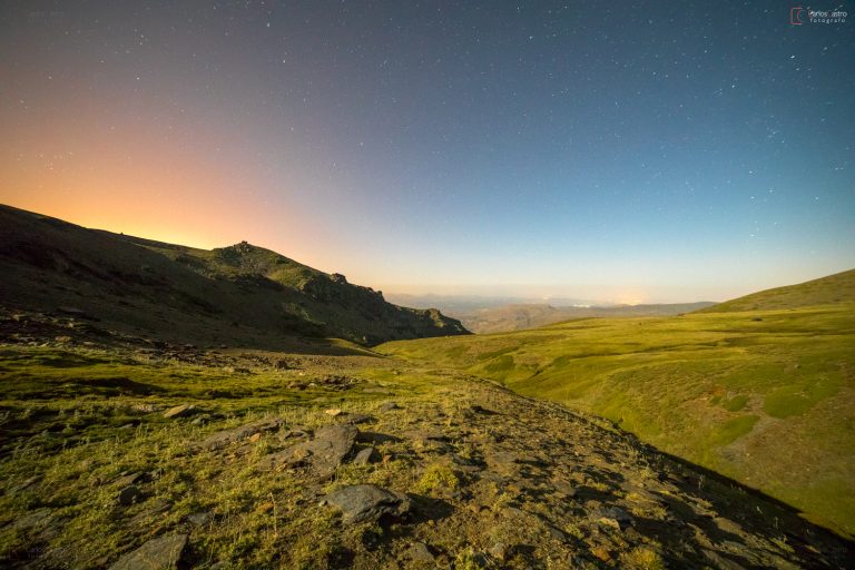 La luz que ilumina este paisaje es la Luna, al fondo a la izquierda se ve la contaminación lumínica de Granada capital y a la derecha de otras poblaciones.